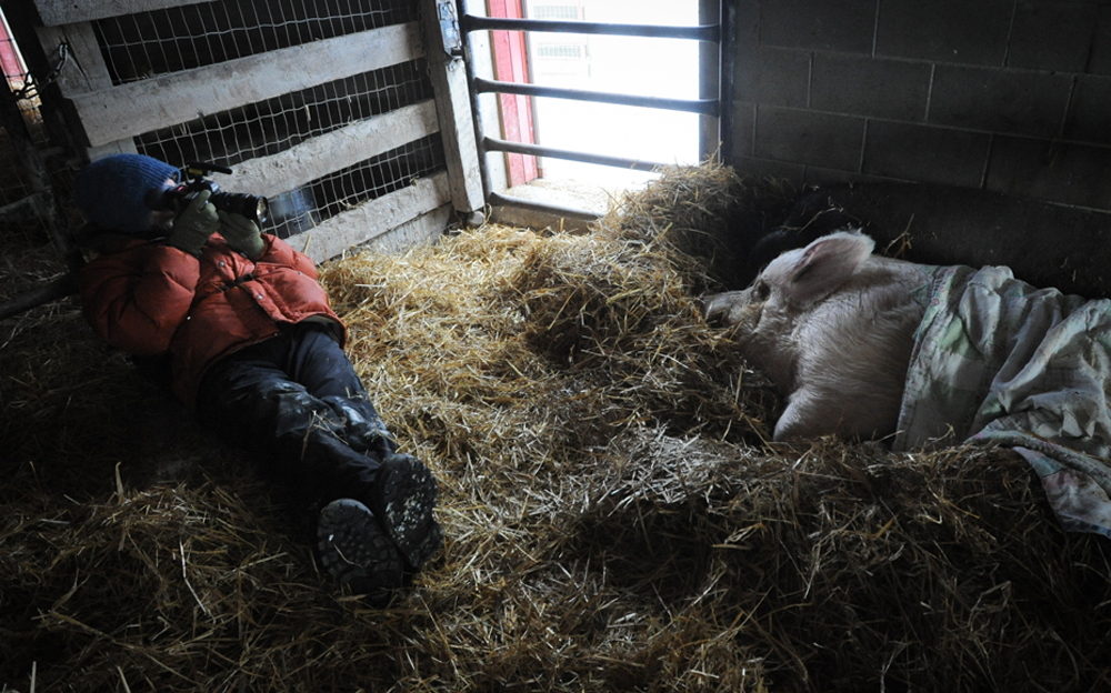 I grappled and marvelled and searched for a compelling angle. In 2006, as I was getting to know Jo-Anne McArthur (Jo) and her photographic work We Animals, cinematic ideas began to stir. Jo’s images invite us to see all animals as individuals. Her intimate photos transport us to the front-lines where we lock eyes with helpless creatures trapped within the machinery of our consumer-driven world.