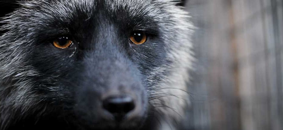 A fox confined to a small wire mesh cage in a crowded fur farm. Large litters of babies are born each spring and then slaughtered in November to December for luxury fur commodities: trims, hats, coats … Photo by Jo-Anne McArthur for The Ghosts In Our Machine.