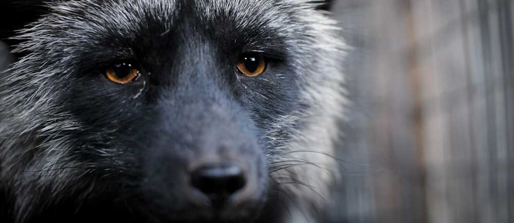 A fox confined to a small wire mesh cage in a crowded fur farm. Large litters of babies are born each spring and then slaughtered in November to December for luxury fur commodities: trims, hats, coats … Photo by Jo-Anne McArthur for The Ghosts In Our Machine.