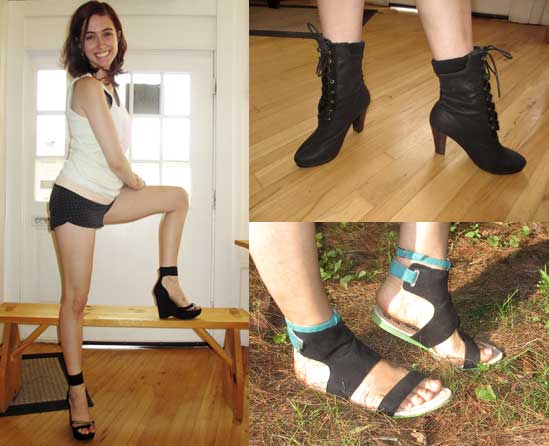 Clockwise from top right – Jamie shows off her new boots, Nina’s new sandals, Jamie models Cow Jones Vegan Boutique’s stunning Sasha sandals by Beyond Skin