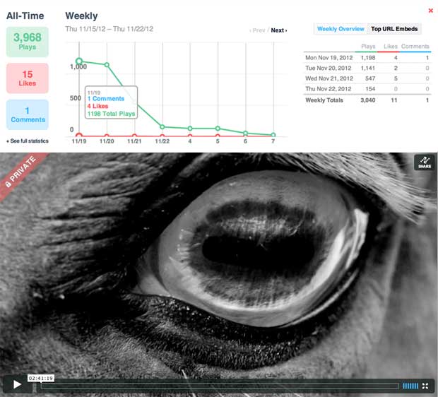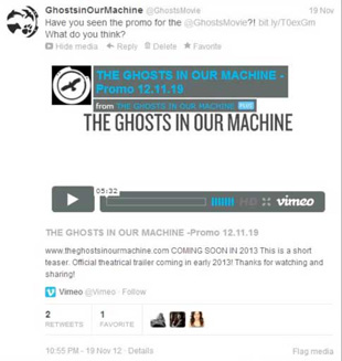 The most re-tweeted tweet this month was the promotional trailer for The Ghosts in Our Machine, followed by Ghost Free recipes. With the RT’s of the promotional trailer, @GhostsMovie gained over 40 followers in just a few days! In total, from November 19th to the 29th there have been 3,968 views of The Ghosts in Our Machine promo.