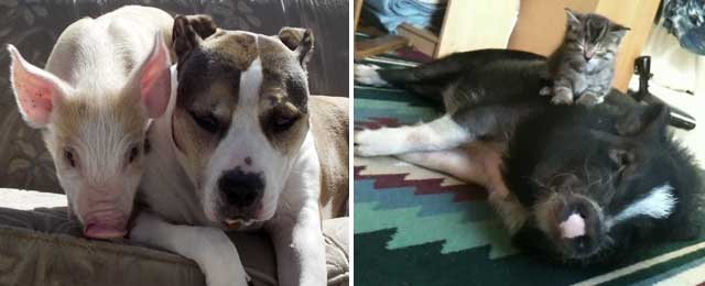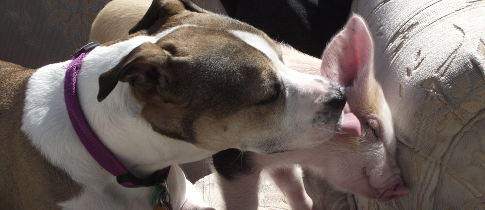 Cleo has her dislikes and likes, she gets moody around her “time of the month”, there are people she adores and those she would rather not deal with. This philosophy also applies to her animal friends. She can figure out how to manipulate to get attention and she definitely lets you know when she has had enough! Her most impressive skills are her ability to manipulate you into getting a treat with some of the most complex problem solving skills I have ever seen in an animal. Of course I didn’t know all these things about her in the beginning. She has taught me so much about what pigs are truly capable of. I was shocked at her interaction with my elderly shih tzu and how she imitated the play behavior of a dog! She learned to sit in less than a day and within a day she was house trained! But her intelligence was not all that made me reconsider all I thought was true about pigs. It was her interactions with a particular abandoned kitten that touched my heart and made me truly understand the depth of a pigs ability to love and nurture. Only about 4 weeks old she showed up at our doorstep and immediately attached herself to Cleo almost knowingly. I watched Cleo tiptoe gently around the tiny fur ball and lie gently singing like a true mother pig to the puffy baby. She watched over her little charge and threatened anyone with her growls and fake charges if she felt anyone was a threat to her new baby. They were inseparable and are friends to this day. Since then we have had numerous litters of kittens and the occasional abandoned one and Cleo is always the same with all the babies that make their way through our doors. Always an adoring, loving foster mom to all the babies who end up here.