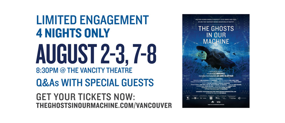 (Toronto – July 21, 2013) After a super successful world premiere at Hot Docs (including two sustained standing ovations, and voted a Top 10 Audience Favourite), followed by a Golden Sheaf Award at the 66th Yorkton Film Festival, and a 4.5 week theatrical run in Toronto, Liz Marshall’s The Ghosts In Our Machine comes to the Vancity Theatre for 4 nights.